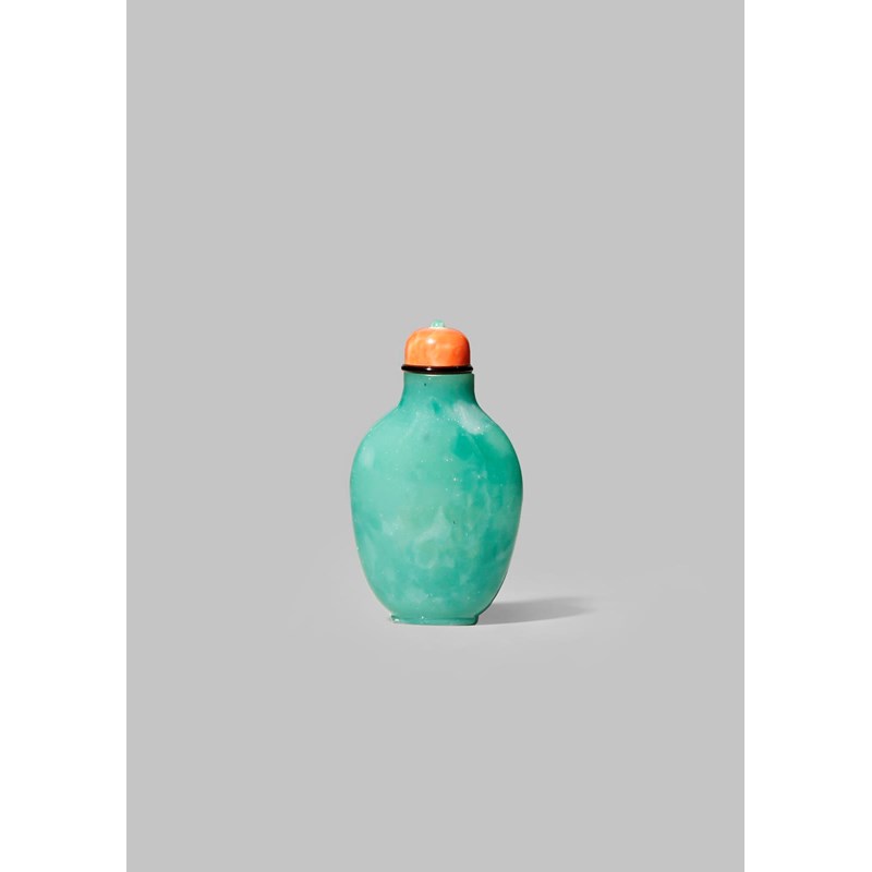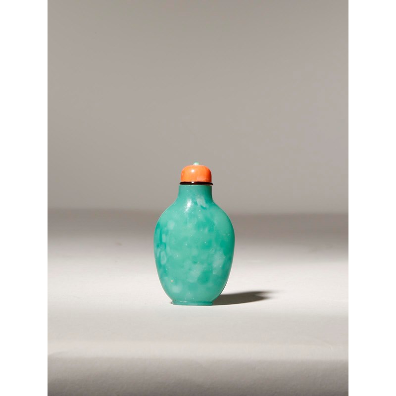 A CHINESE GLASS SNUFF BOTTLE IMITATING JADEITE 18/19TH CENTURY With a plain ovoid body raised on...