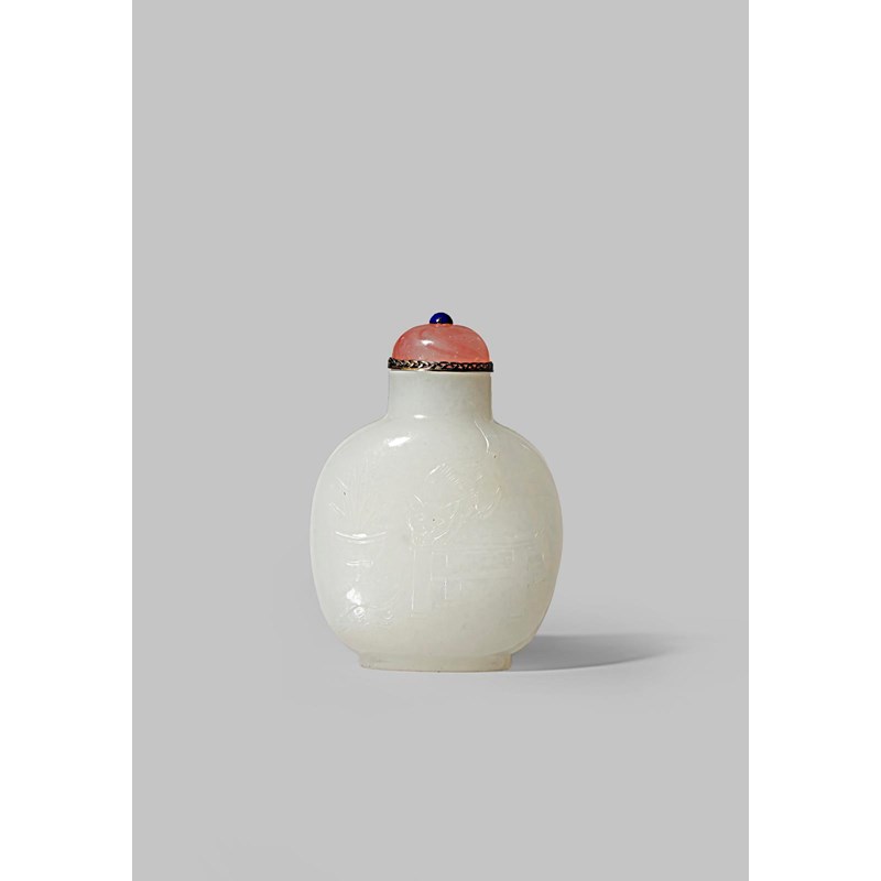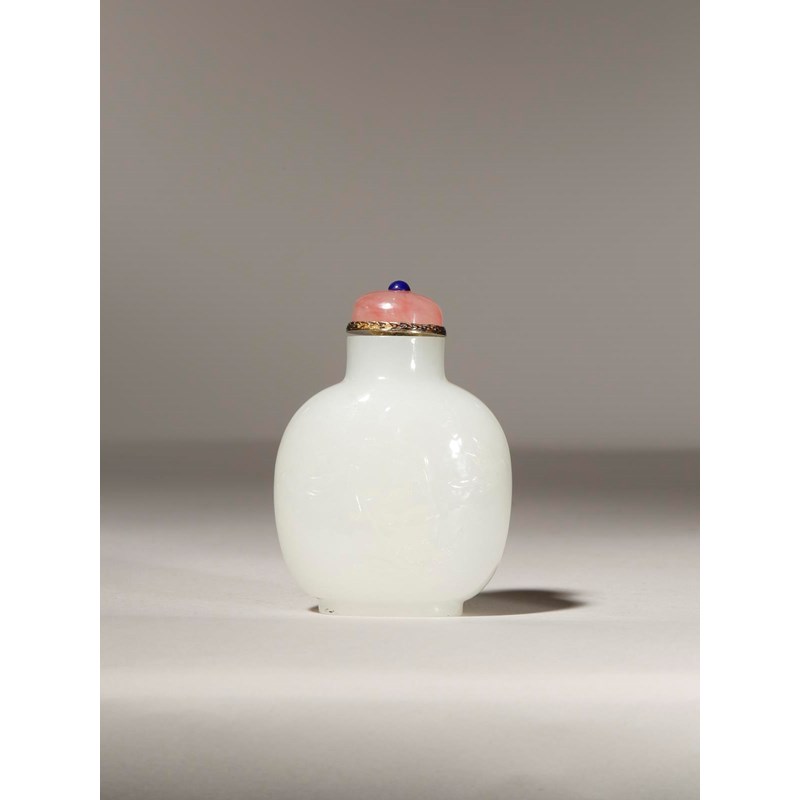 A FINE CHINESE WHITE JADE 'CATS' SNUFF BOTTLE QING DYNASTY With a flattened ovoid body carved...