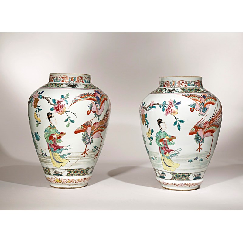 Each with an ovoid tapering body painted with colourful enamels and gilt, with three ladies by a blossoming tree gazing at two phoenix descending into their garden, with bands of shaped cartouches containing crabs, fish and crustacea against a diaper ground, and further floral bands to the shoulder and the foot, 34.5cm. (2)