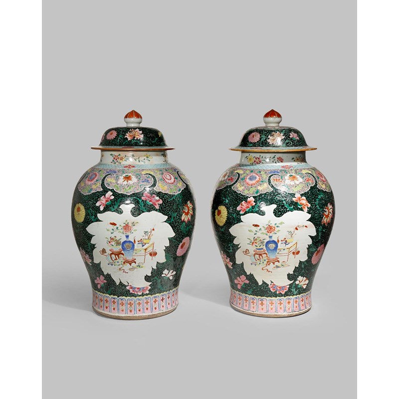 Each painted with blossoms and scrolling foliage on a black ground, with two large white leaf-shaped panels with precious objects, the foot rims with lappet bands, the shoulders with ruyi-head and diaper bands, the lids mirroring the design, the finials formed as lotus buds, 60cm. (4)