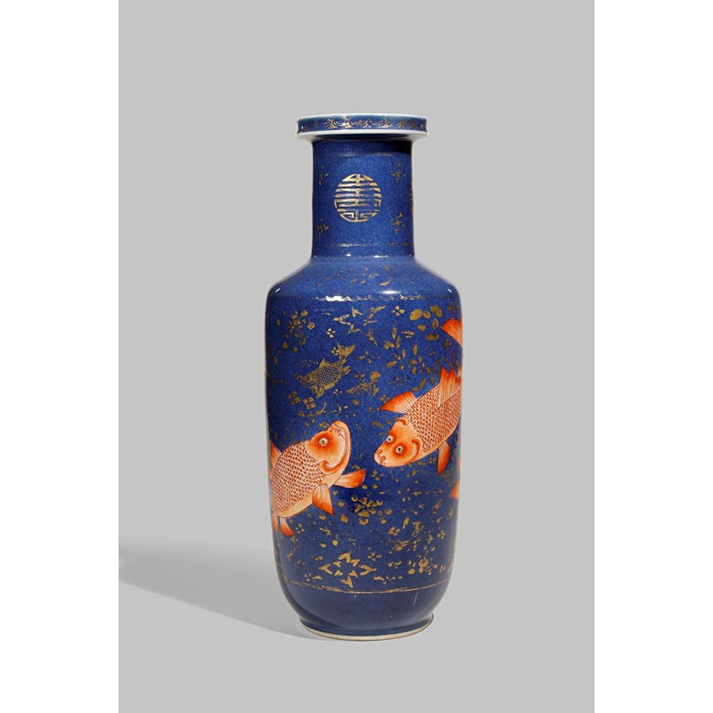 A CHINESE POWDER BLUE-GROUND ROULEAU 'CARP' VASE KANGXI 1662-1722 Decorated with four iron-red...