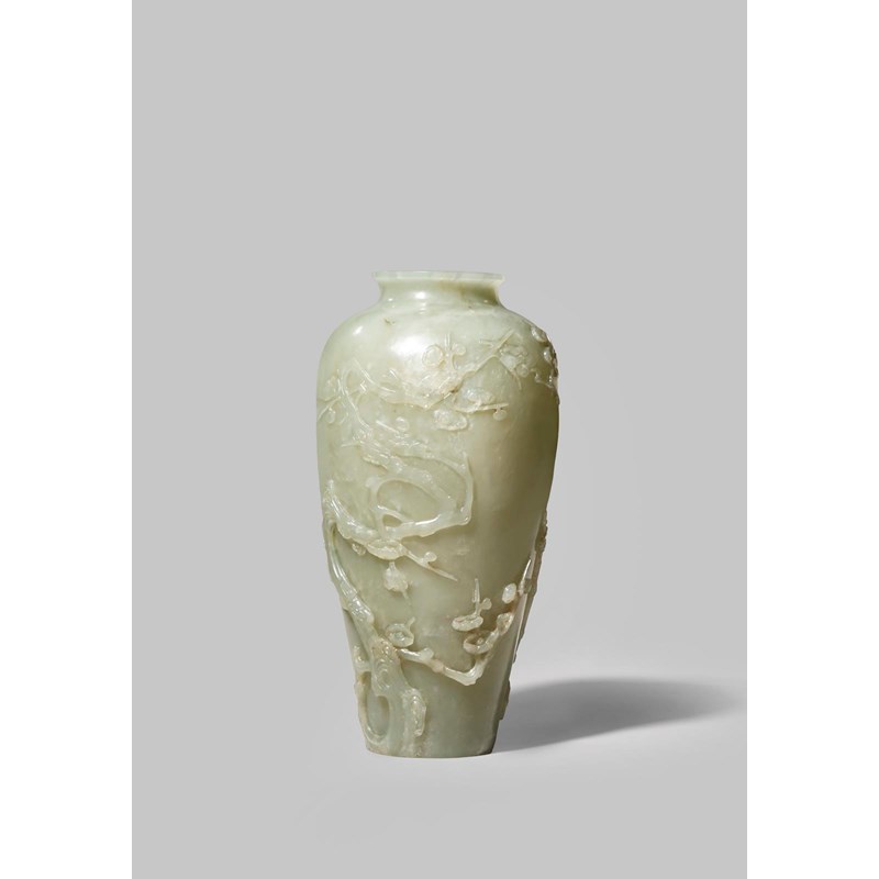 A FINE CHINESE PALE CELADON JADE 'PRUNUS' VASE QIANLONG 1736-95 With a tapering ovoid body...