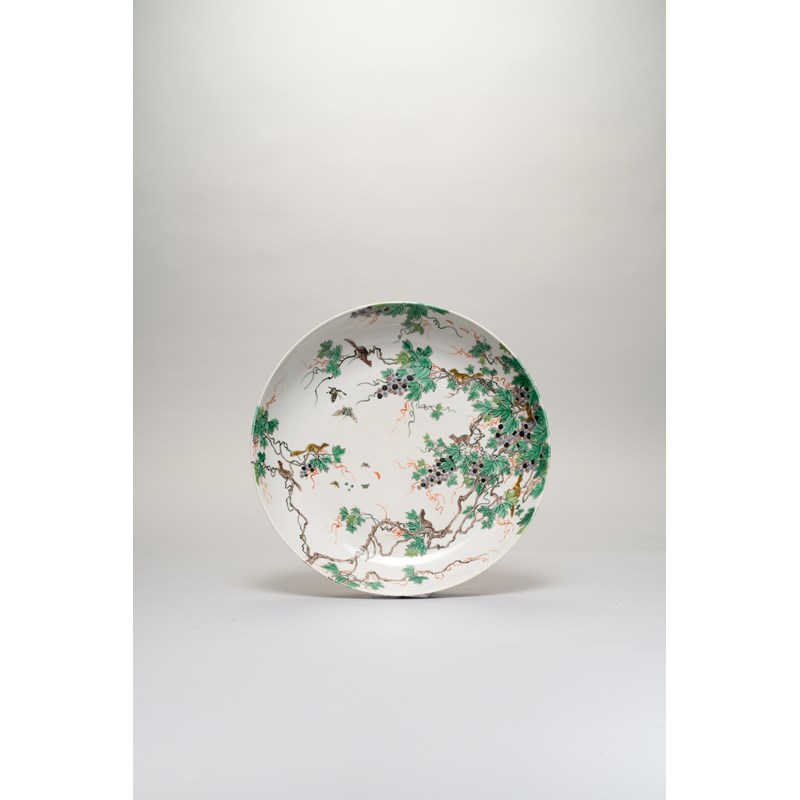 The glaze of bluish tint, the body enamelled in the famille verte palette with a fruiting grape vine growing from green rocks beside iron-red lingzhi to the underside and spreading over the interior in which nine squirrels play and small butterflies fly among tendrils and fruits, 21cm.