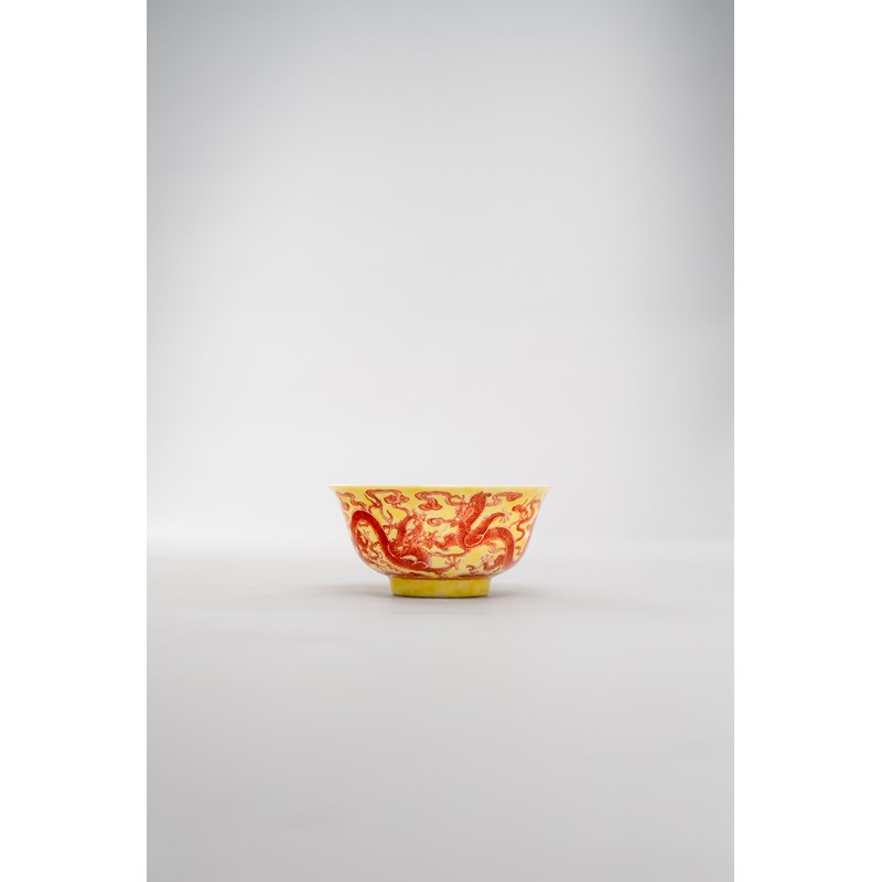 A RARE CHINESE YELLOW-GROUND AND IRON-RED DECORATED 'DRAGON' BOWL