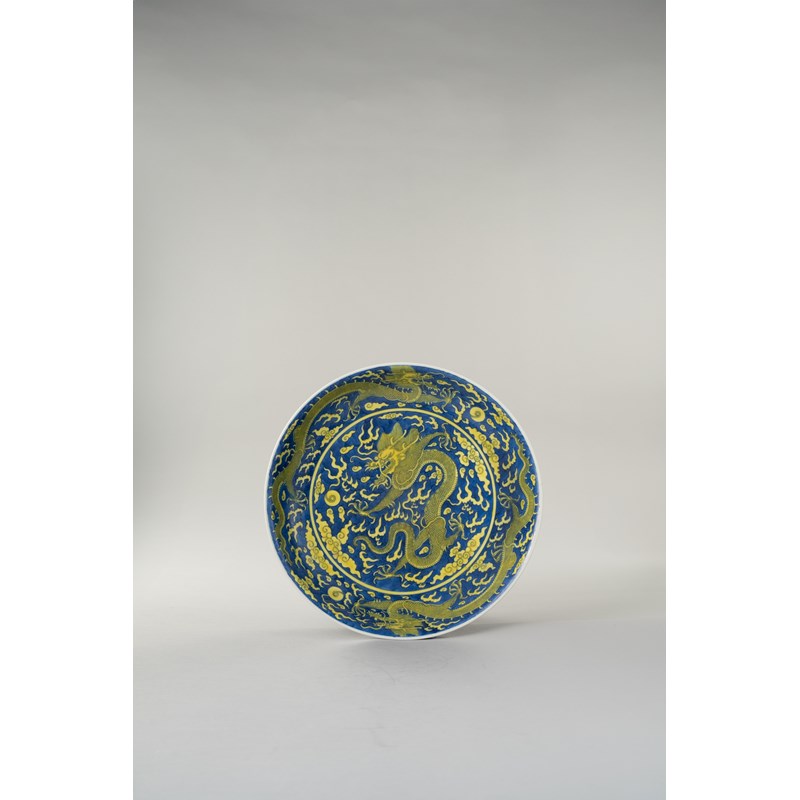 This design and colour combination appears to be based on porcelains from the Kangxi period. Cf. Sotheby’s Hong Kong, 11th April 2008, lot 3017 for another Jiaqing blue ground yellow-enamelled ‘dragon ‘dish.