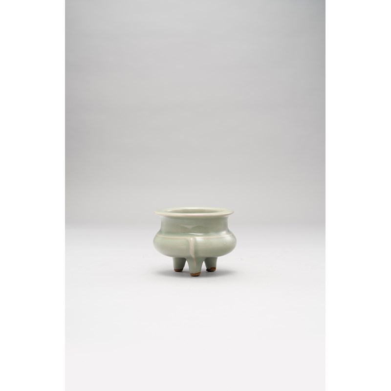 A SMALL CHINESE LONGQUAN CELADON TRIPOD INCENSE BURNER