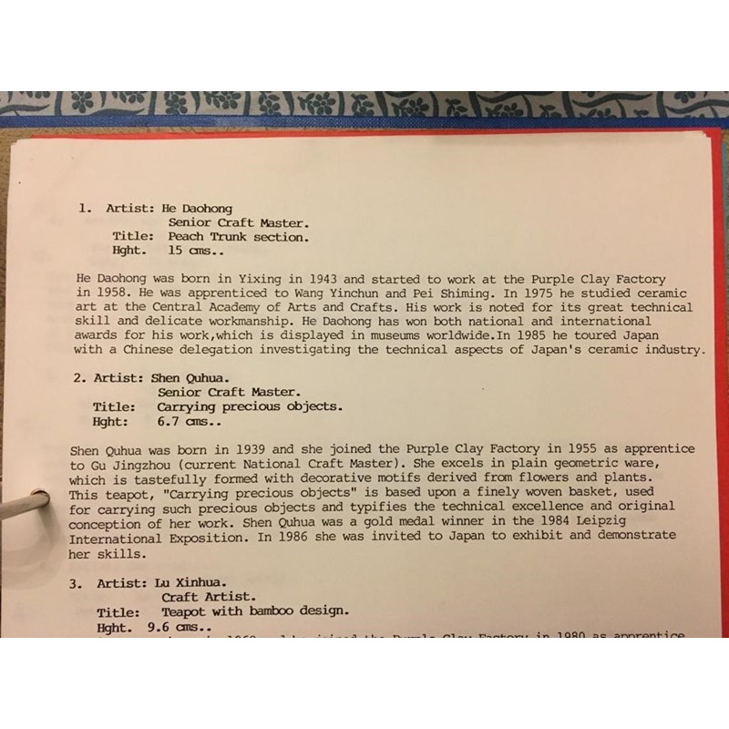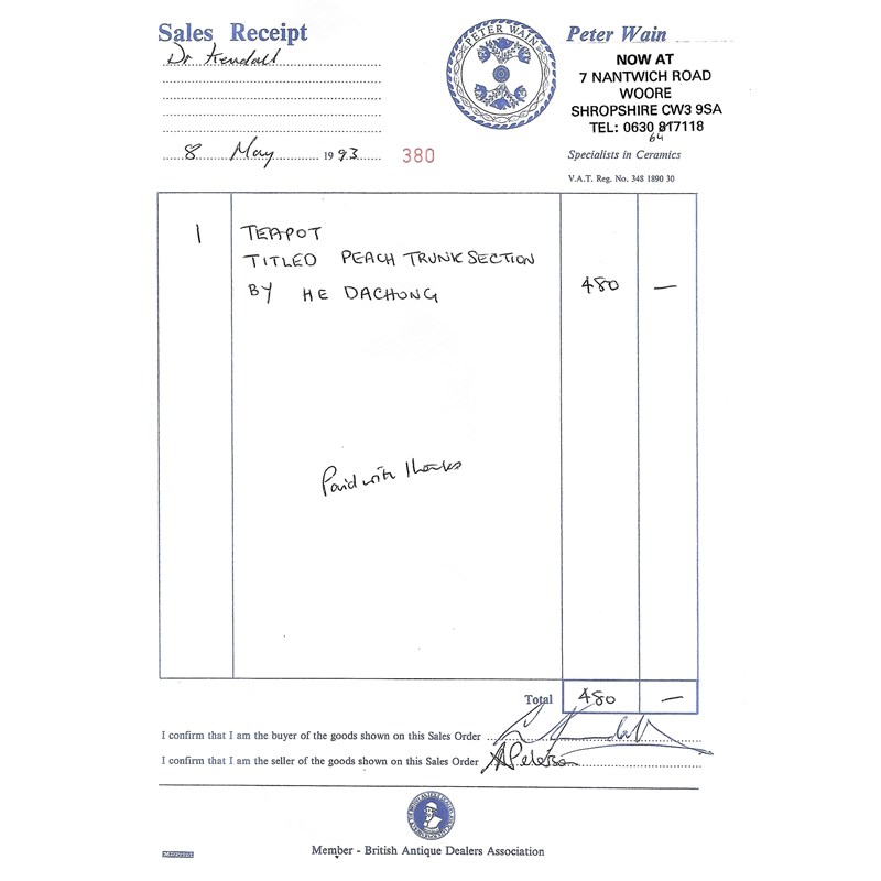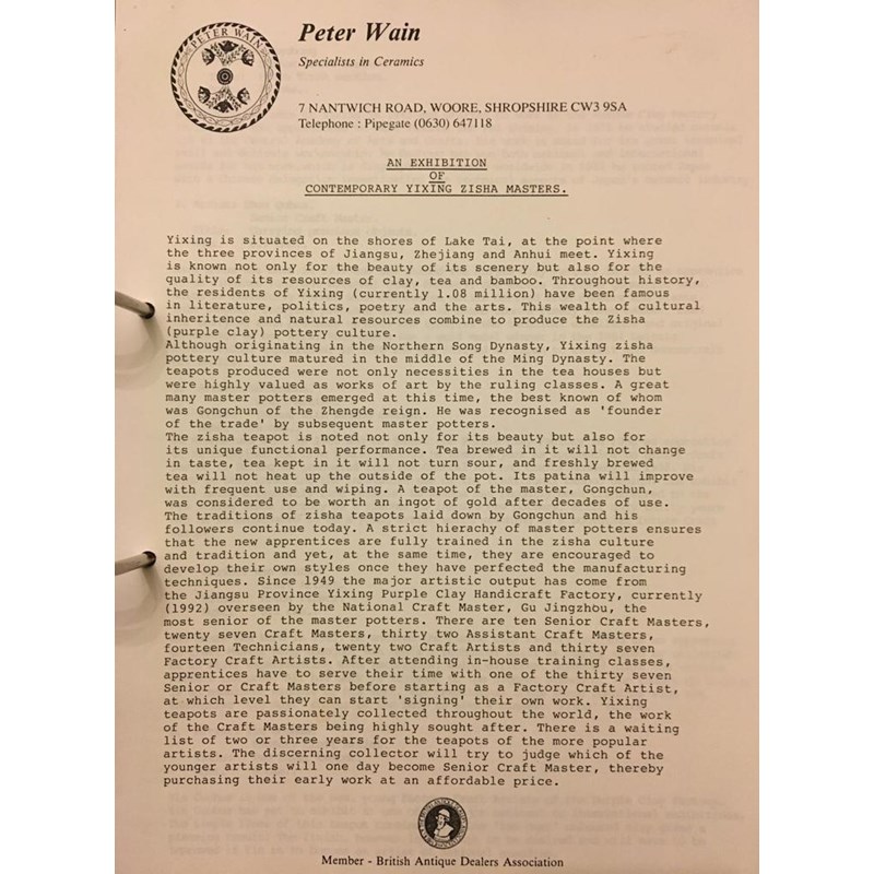 Provenance: from the collection of Dr Neil Kendall, acquired from Peter Wain's first exhibition of 18 teapots, entitled 'Contemporary Yixing Zisha Masters', which ran concurrently with his 'Heavenly Pieces' exhibition,opening on Saturday, 8th May 1993, a copy of the invoice is available.