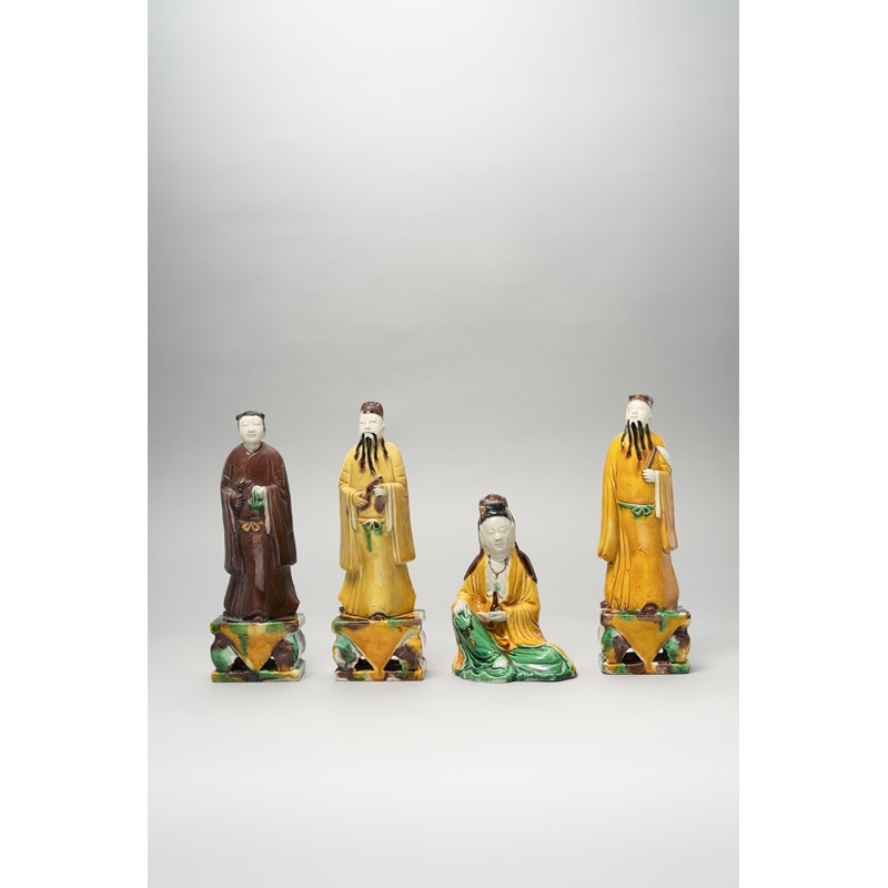Three standing on rectangular plinths, the fourth a seated figure of Guanyin holding a rosary and a bottle, all decorated with green, brown and mustard yellow enamels, 22cm. (4)