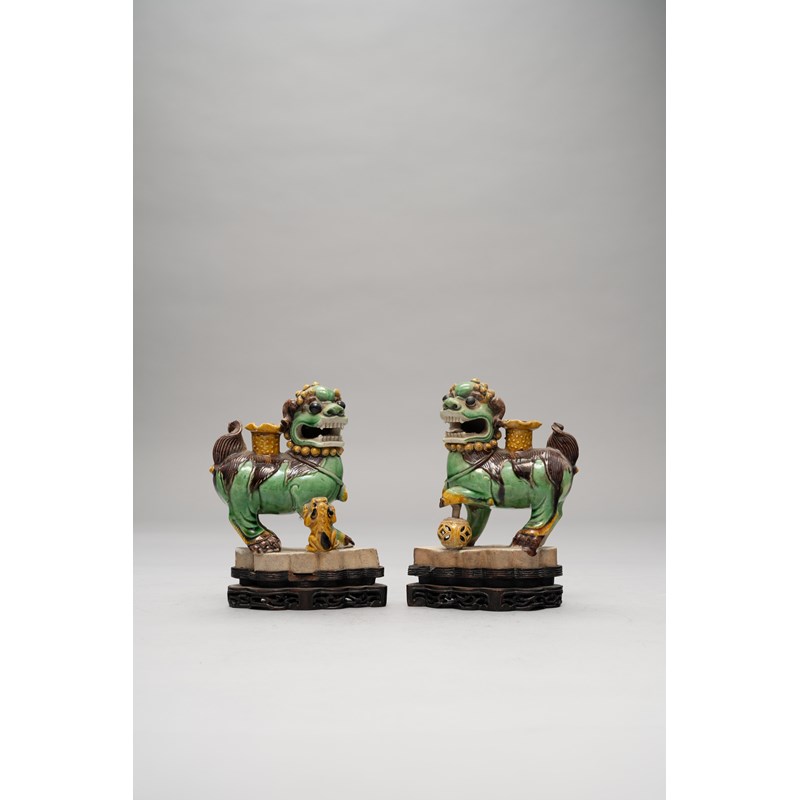 The male with a reticulated brocade ball, the female with her puppy, each with a joss stick holder to their backs, and standing on artemisia leaf bases, paper label for John Sparks, together with fitted wood stands and a paper label inscribed 'Sotheby's Feb 1964, Ionides Collection ...', 13cm. (4)