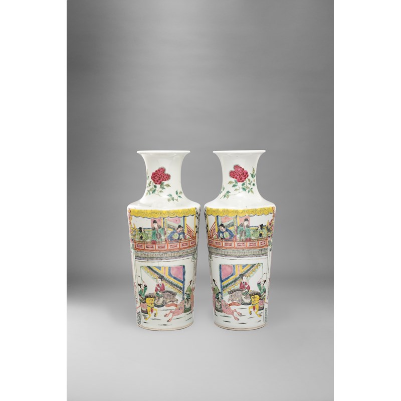 The tapering cylindrical bodies brightly painted with the lady generals from the Yang family practising their equestrian skills beneath a balcony amongst wutong trees and floral trellis, overlooked by a group of gentlemen on a canopied terrace, the necks with large peony sprays and sprigs of lingzhi, 45cm. (2)