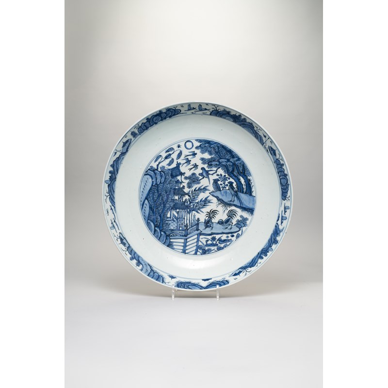 Brightly painted in different shades of cobalt blue with a three-tiered pagoda and an abundance of different birds, including chickens, pheasants, parrots and swallows and with squirrels amidst bamboo and a large cicada, the border painted with small sampans, huts and pagodas on a rocky river landscape, the reverse with four fruiting peach branches, the underside unglazed, 44cm.