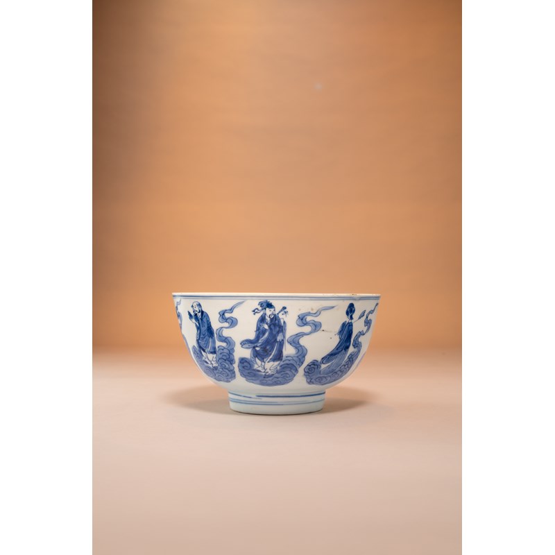 A CHINESE BLUE AND WHITE 'IMMORTALS' BOWL