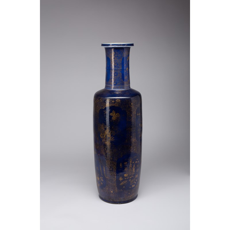 A MASSIVE CHINESE 'QIN QI SHU HUA' POWDER BLUE-GROUND AND GILT DECORATED ROULEAU VASE