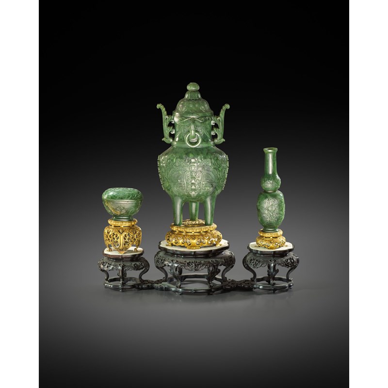 Comprising: a tall tripod incense burner and cover of archaic ding form with butterflies to the neck suspending loose rings and two upright handles formed as leaves, a slender gourd-shaped incense tool vase rising from a short flared foot to an inverted rim, and an oval box with a domed cover, each decorated in relief with stylised floral scrolls and sprays, the deep green stone of each vessel with black specks and dark inclusions, each item raised on an elaborate openwork gilt-bronze base, all supported on a unified wood stand carved and pierced with scrolls and ruyi motifs, 22.9cm max. (6)