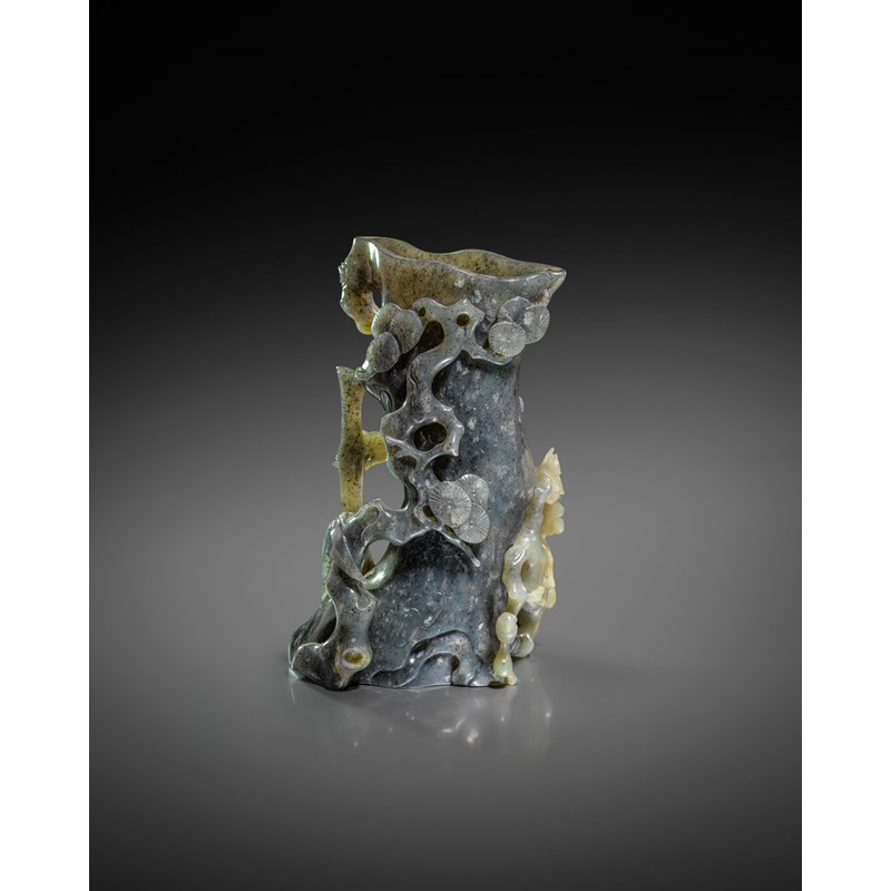 Cf. Compendium of Collections in the Palace Museum, Jade, vol.8, p.227, no.186 for a comparable black and pale celadon jade vase carved with a phoenix amidst bamboo and lingzhi.