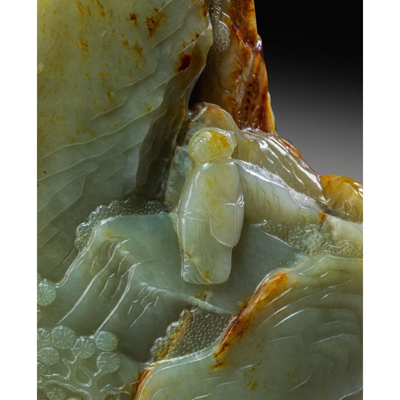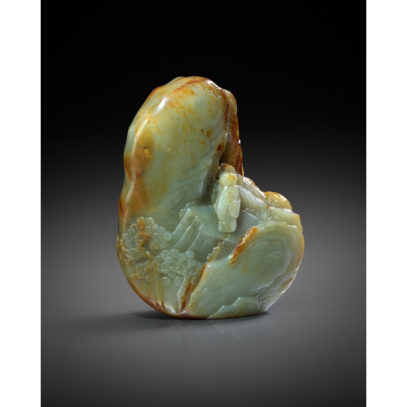 The subject on this carving is inspired by traditional Chinese landscape painting. The Chinese word for 'landscape painting' is shanshui, literally translating as 'mountains and water'. Landscape painting has long held an important position in Chinese art, but its principles were not applied to three-dimensional jade carvings until the early Qing dynasty. Landscape painting was not only valued as a means of expressing an admiration of nature, but also as a way of representing the philosophical relationship between man and the natural world. As is typical in landscape painting, the figure on this jade boulder is presented as a passive spectator within the free and undomesticated vastness of the natural setting.