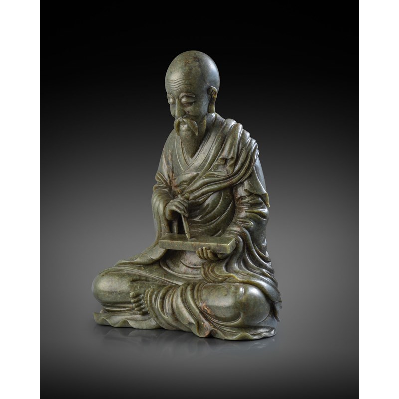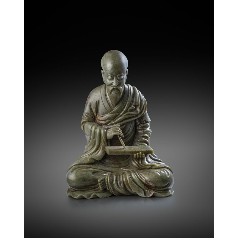 Depicted seated in dhyanasana holding a tablet in his left hand and a brush in his right, he wears long layered robes which fall in folds around his bare left foot, his well-defined face detailed with downcast eyes and wrinkles to his forehead, with finely incised hairs to his long beard and moustache, the deep green stone with brown and dark inclusions, 23.5cm.