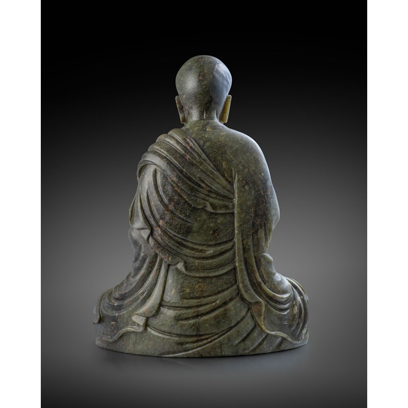 Cf. Catalogue of the International Exhibition of Chinese Art, 1935-6, no.2860 for a similar figure lent to the exhibition by Mr and Mrs Edward Sonnenschein; see also G Wills, Jade of the East, p.104, nos.63-64 and N Zhou, Ancient Jades in Man, Immortal and Buddha, p.309, nos.360-361 for further related examples; see also Asian Art I, 17th November 2010, lot 337 for a comparable spinach-green jade figure of Buddha of the same size previously sold in these rooms.