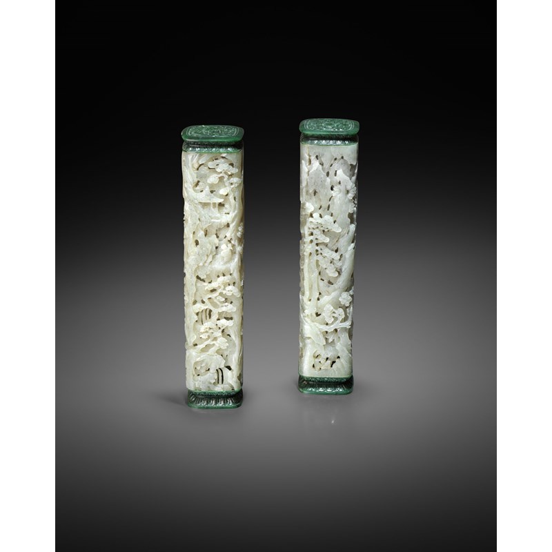 Each with a square-section body, worked in relief and openwork with figures in continuous mountain landscapes, the depicted scenes including two young boys walking along a path, three scholars looking at a painting, an old man and his young attendant beneath a pine tree, and Shoulao accompanied by his deer, with dark speckles dispersed through the pale stone, the waisted spinach-green tops and bases carved with bands of lappets, the ends pierced with flowers surrounded by scrolling foliage, 28.2cm. (2)