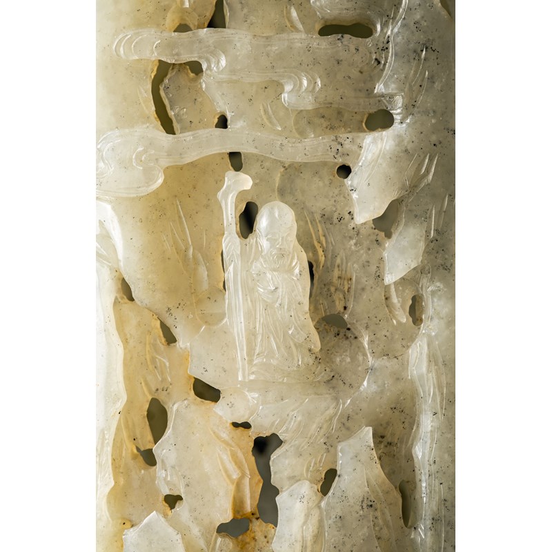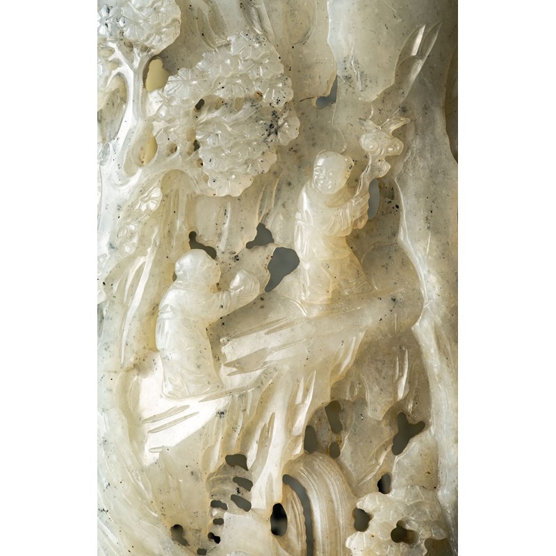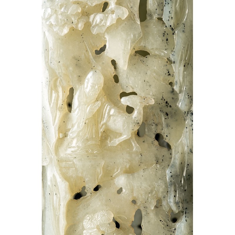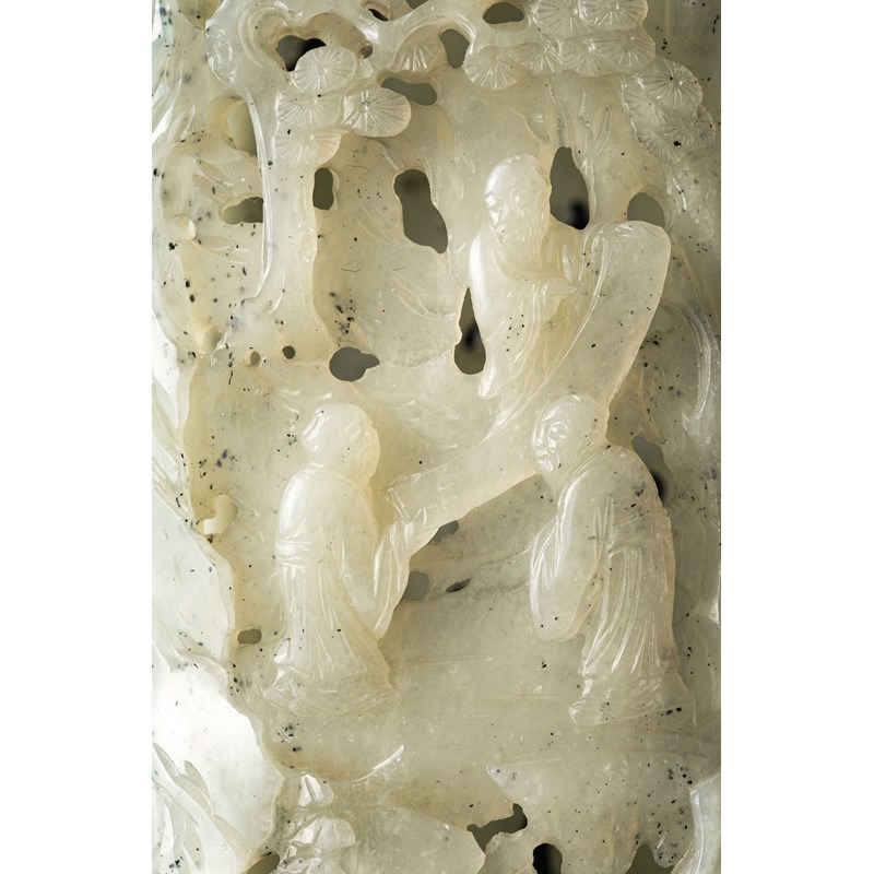 Such pictorial representations are clearly based on traditional landscape paintings in ink. The subjects express belief in longevity and immortality. In Chinese religion, Immortals are always associated with mountains and hills. The carving is of exceptional quality. One can imagine the incense smoke wafting through the pierced holes, like clouds moving through high mountains, bringing these scenes to life. In the early Qing period, such landscape art was practised by literati artists and was much favoured at the Imperial Court, in particular by the Yongzheng and Qianlong Emperors. Here, the jade carver successfully crafted scenes from two-dimensional landscape paintings into this three-dimensional incense burner, creating a masterpiece that can equal any other great works of art.