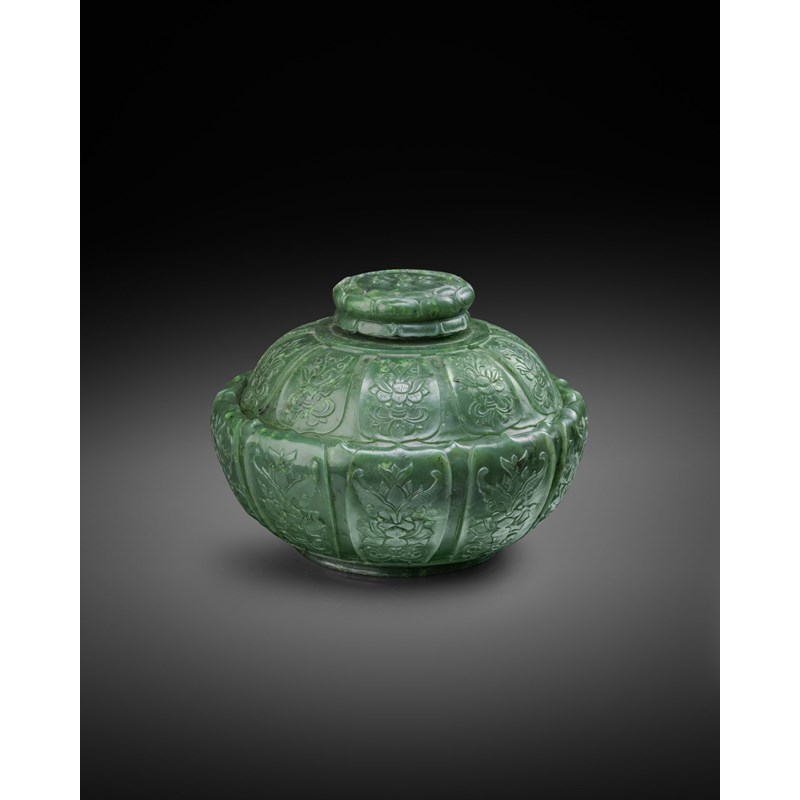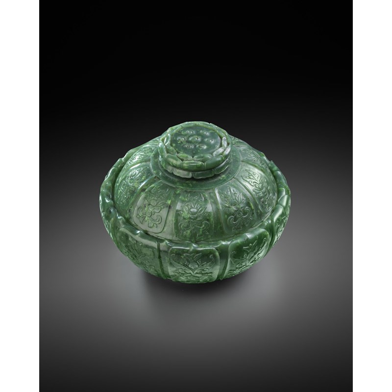 The well-rounded sides rising to an inverted mouth, worked to the exterior with ten large petals enclosing stylised lotus sprays, the tips of the petals resting on the rim, with similar decoration to the domed cover, surmounted by a finial formed as a lotus flowerhead detailed with seven seeds, all raised on a short waisted foot, the stone of a dark green tone, 13.4cm dia. (2)