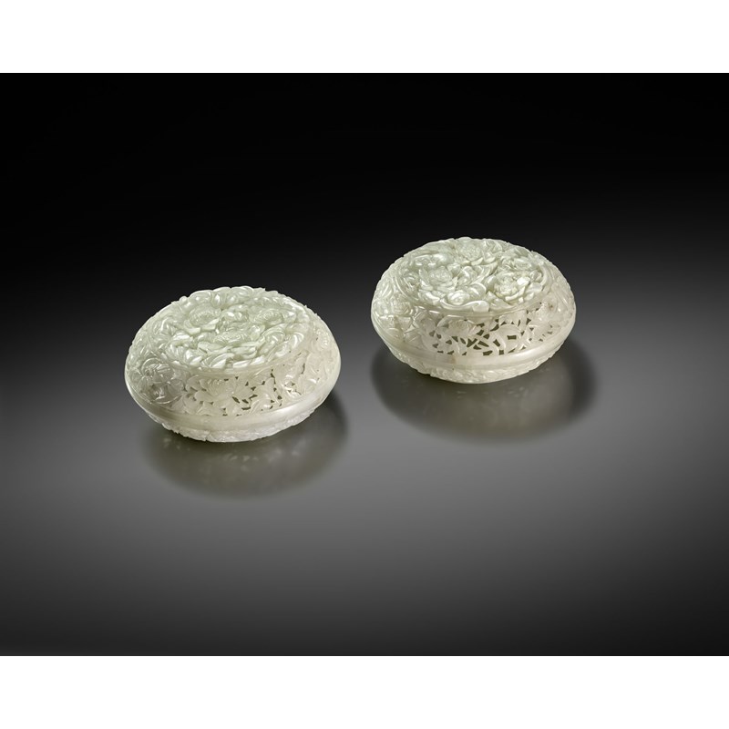A PAIR OF FINE CHINESE WHITE JADE CIRCULAR INCENSE BOXES AND COVERS