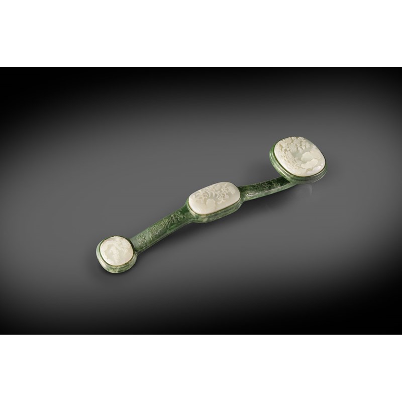 The mottled dark green sceptre inset with three oval white jade plaques to the head, stem and terminal, the largest worked in relief with two butterflies fluttering above blossoming peony and aster in a mountainous landscape, the central panel carved with a flowering chrysanthemum branch growing amidst rockwork, the smallest plaque depicting a gnarled prunus tree, with twin-fish and a small bat surrounding a fylfot and qing to the upper section of the curved stem, the lower section of the shaft decorated with a pair of bats encircling a shou character and beribboned cash, the undecorated underside with a ribbed edge, 42.5cm.