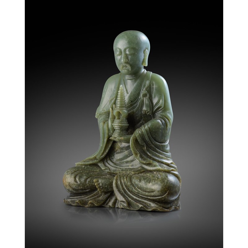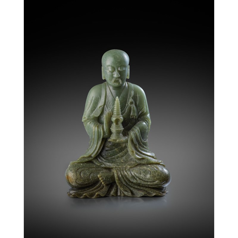 Carved seated in dhyanasana wearing a shawl and long robes, his garments held by a clasp at his left shoulder, he holds a stupa in his left hand whilst raising his right hand behind the precious object in a variation of abhaya mudra, his serene face detailed with a small finely incised moustache and beard, the green stone with brown flecks and inclusions, 23.5cm.