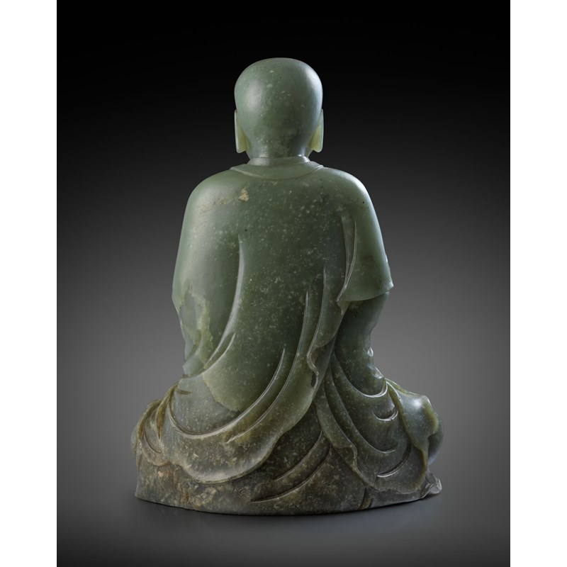 Cf. Catalogue of the International Exhibition of Chinese Art, 1935-6, no.2860 for a similar figure lent to the exhibition by Mr and Mrs Edward Sonnenschein; see also G Wills, Jade of the East, p.104, nos.63-64 and N Zhou, Ancient Jades in Man, Immortal and Buddha, p.309, nos.360-361 for further related examples; see also Asian Art I, 17th November 2010, lot 337 for a comparable spinach-green jade figure of Buddha of the same size previously sold in these rooms.