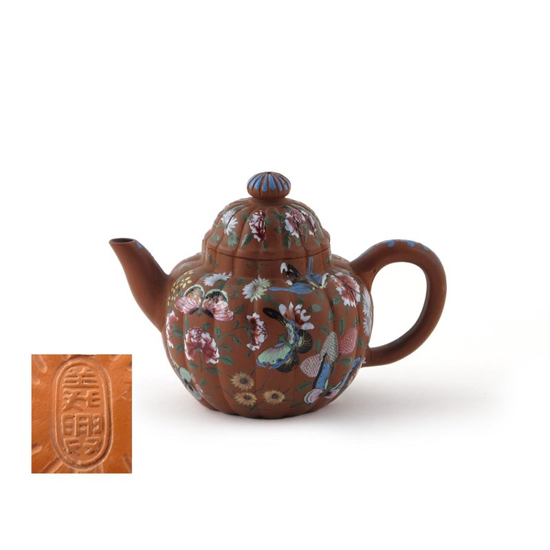A small Yixing chrysanthemum teapot and cover 19th century, enamelled with butterflies and flowers, the handle and spout detailed in blue, impressed mark to the base, 15cm. (2)