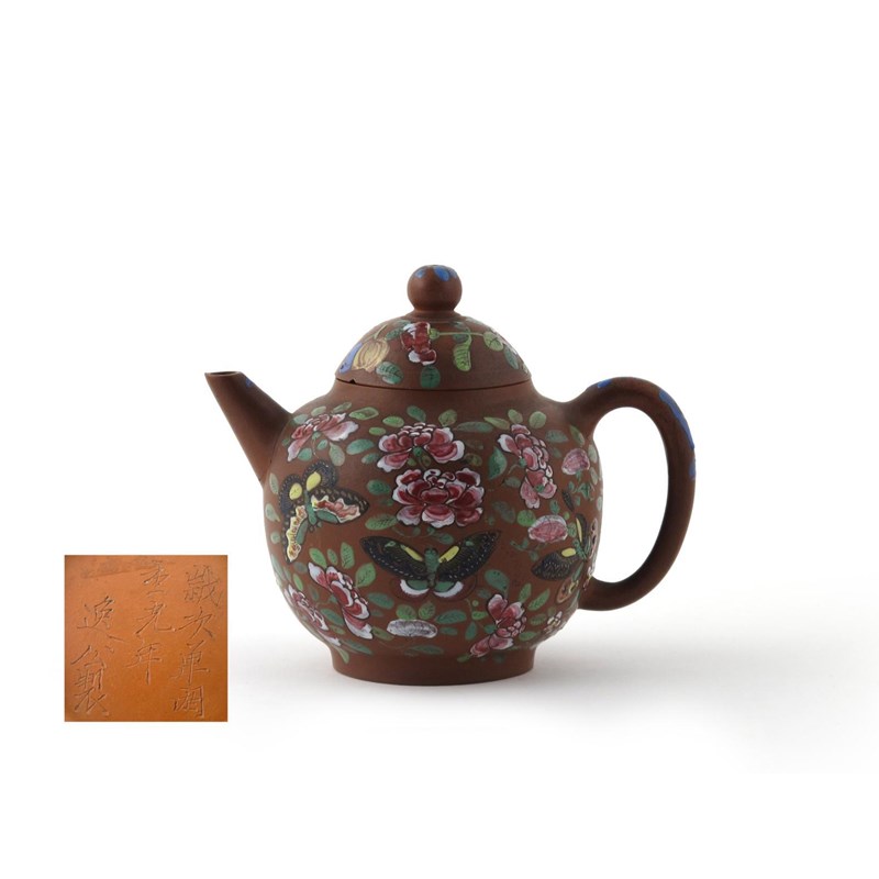 A small Yixing teapot and cover 19th century, the globular body enamelled to each side with three butterflies amidst flowering peony, incised calligraphic mark to the base, 14.5cm. (2)