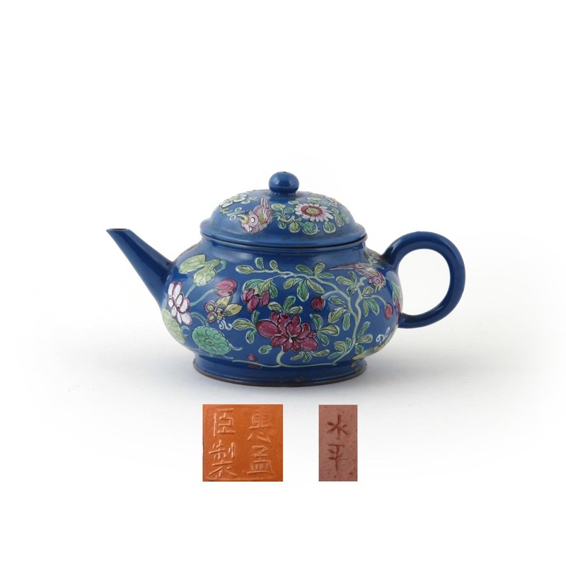 An enamelled Yixing teapot and cover 19th / 20th century, enamelled in the Nonya style with birds and butterflies above lotus on a blue ground, incised and painted characters to the cover, four character seal mark to the base for Hui Mengchen, 13cm. (2)