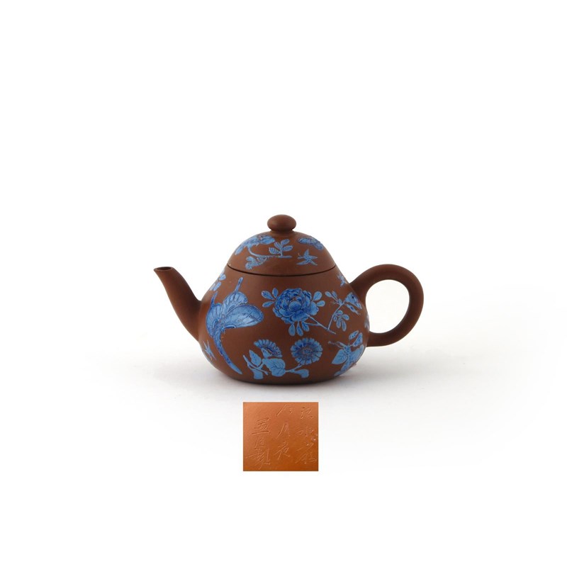 An Yixing teapot and cover 19th century, finely enamelled with butterflies, flowers and gourds in two shades of blue, faint traces of gilt detailing, three columns of incised calligraphy to the base including Mengchen, crack to the cover, 15.8cm. (2)