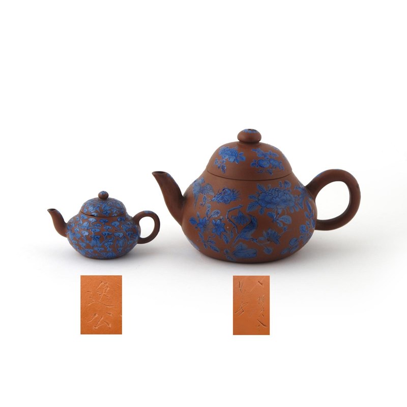 Two enamelled Yixing teapots and covers 19th century, the larger painted with songbirds amidst flowers and fruits, the smaller with bats and ruyi cloud scrolls, both with script marks to the base, 18.7cm max. (4)