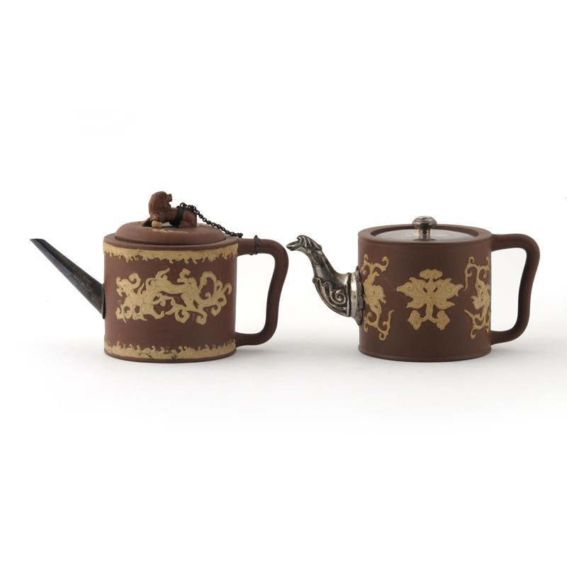 Two cylindrical Yixing teapots and covers 18th century, applied with stylized dragons and foliate motifs in pale slip, one cover with an impressed mark, replacement metal spouts and one replacement cover, 18.5cm. (4)