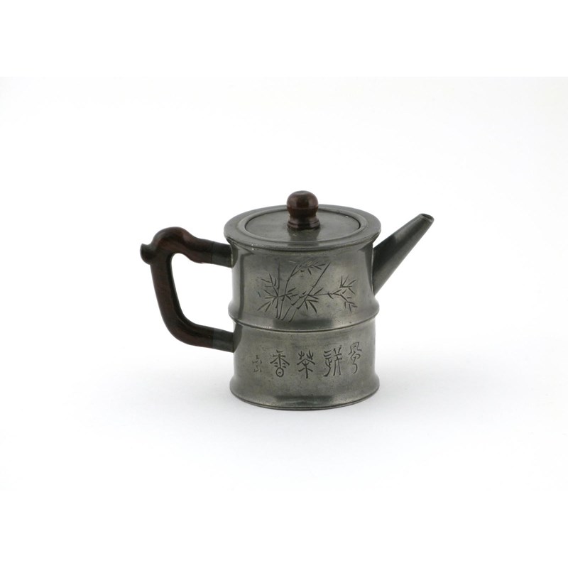 An Yixing pewter-encased teapot and cover 1st half 19th century, the body formed as a bamboo section and incised with bamboo, prunus and calligraphy, the interior with an applied Yang pengnian zhi seal mark, 15.2cm. (2)