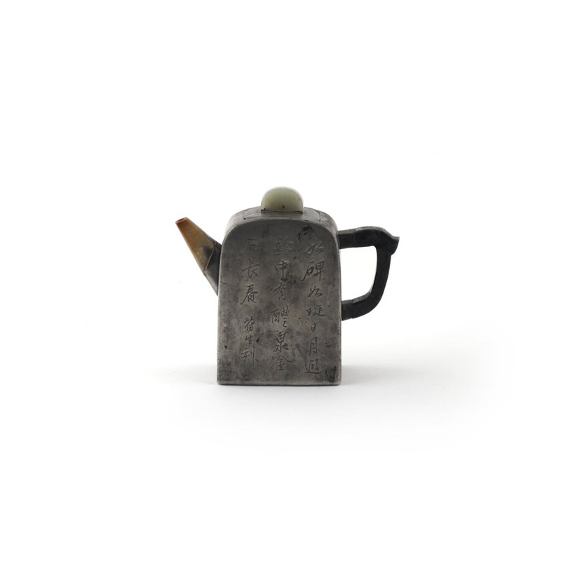 A pewter-encased Yixing San Ke Zhu teapot and cover 19th century, incised with a figure seated on a willow branch, the reverse with calligraphy, hardstone handle, spout and finial, applied seal mark to the interior, signed '?? Sheng', the cover a possible replacement, 14.5cm. (2)