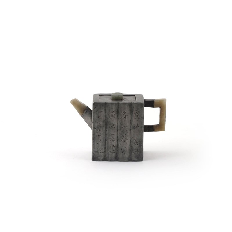 A pewter-encased Yixing San Ke Zhu teapot and cover 19th century, one side incised with prunus, the other with calligraphy, with jade handle, spout and finial, Shi De Tang seal mark to the interior (Hall of Worldly Virtue), 14.5cm. (2)
