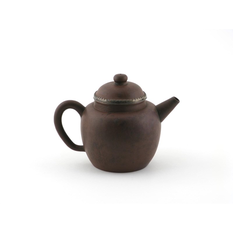 An early Yixing teapot and cover 1st half 17th century, modelled with a squat oblique spout, the cover with a silver metal mount, the cover damaged and repaired, 19.5cm. (2)