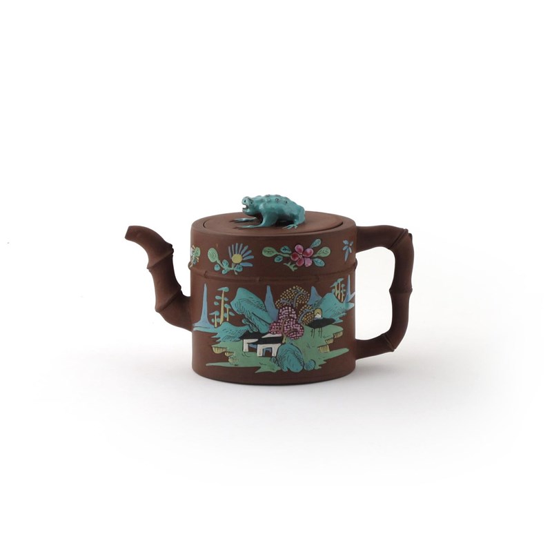 A large Yixing enamelled teapot and cover 2nd half 18th century, each side painted with trees and buildings in a mountainous landscape, the neck with flowers and a tied gourd, Liu Hai's toad forming the cover's finial, 22cm. (2)