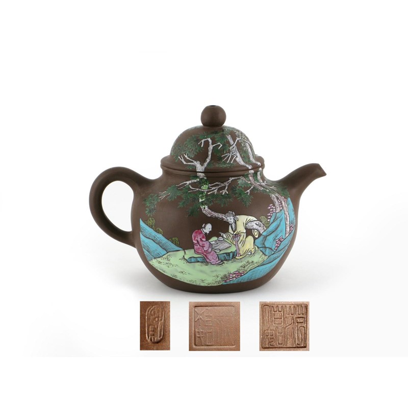 A massive enamelled Yixing teapot and cover 20th century, one side painted with two figures making tea beside a river, the reverse with two figures playing Go, seal marks to the base, cover and handle, 32cm. (2)