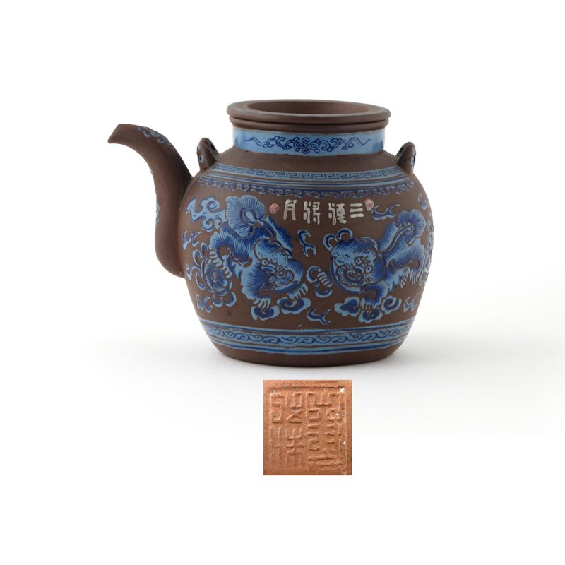 A large enamelled Yixing teapot and cover 19th / 20th century, painted with two lion dogs at play, beneath spearhead and key fret borders, four character enamelled mark, the cover impressed with two seal marks, the base with a square seal mark, the metal handle lacking, 22cm. (2)