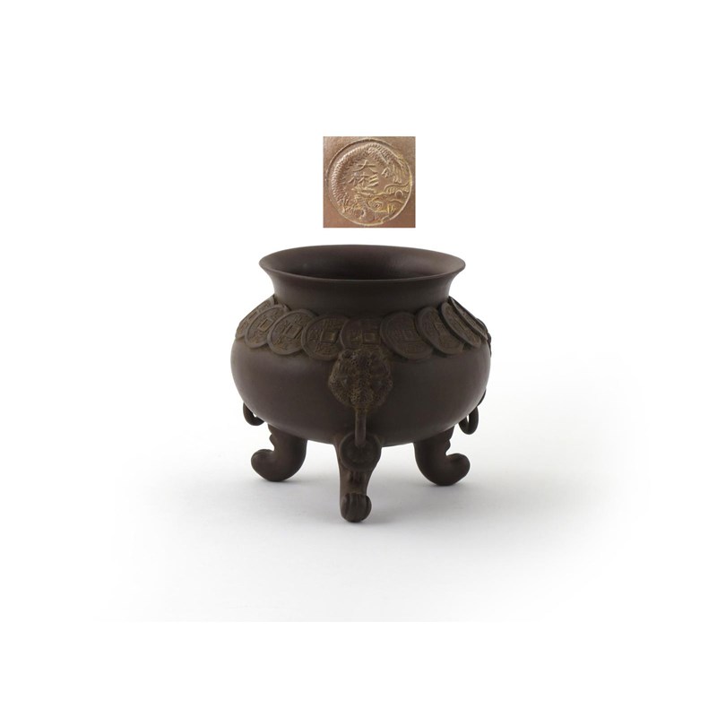 An Yixing tripod censer 19th century, the shoulders applied with a band of cash, each paw foot beneath a mask head handle with a loose ring, impressed dragon mark to the base, 17cm.