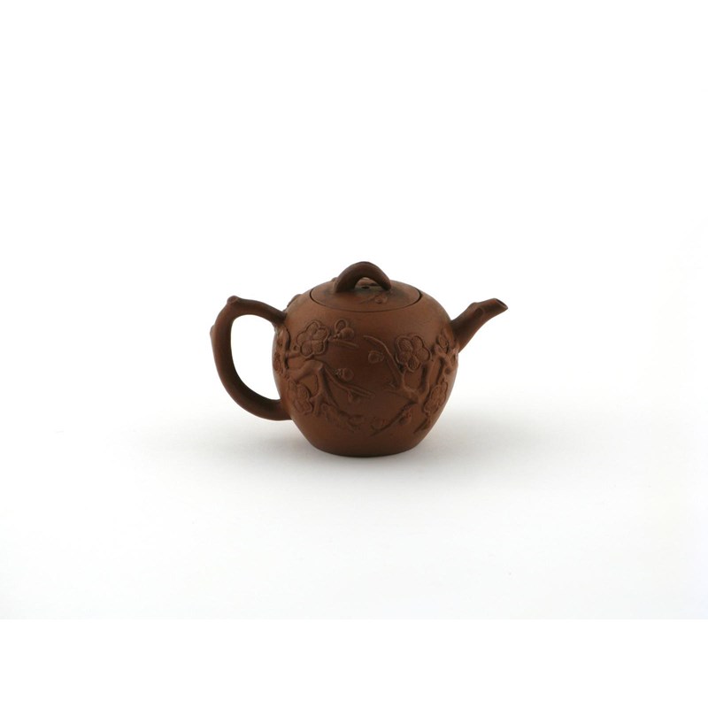 An Yixing teapot and cover 1st half 18th century, applied with large sprays of blossom issuing from the spout and handle which in turn are formed as twigs, minor chipping, 15cm. (2)