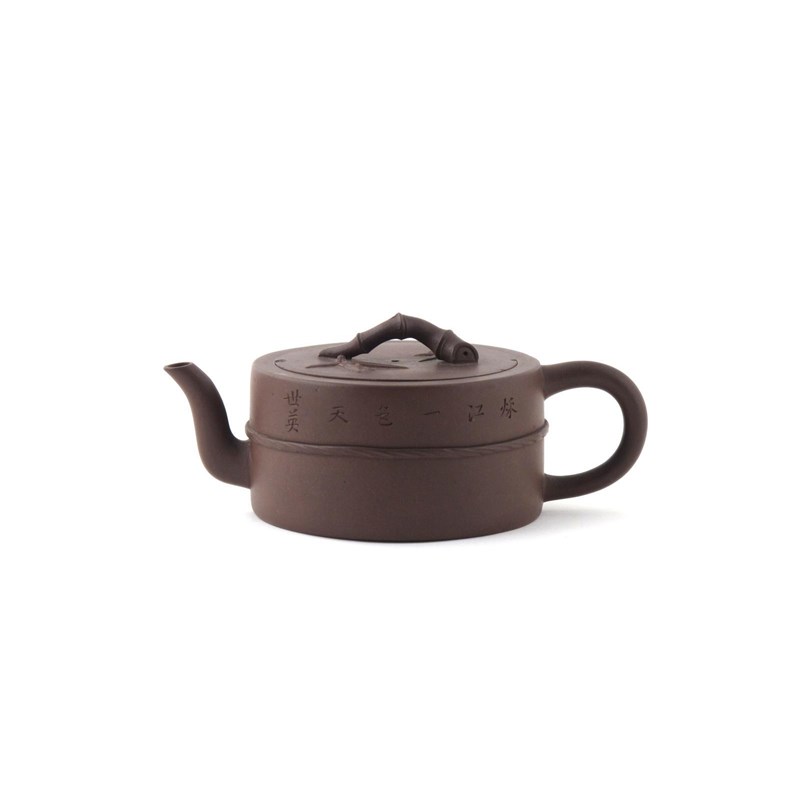 An Yixing teapot and cover 2nd half 18th century, the drum-shaped body a rich chocolate brown, the cover with a bamboo moulded finial, 19cm. (2)