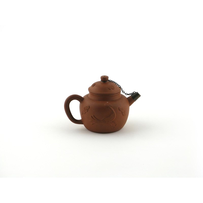 A small Yixing teapot and cover 17th century, one side applied with a cockerel amongst stylized cloud scrolls, the reverse with a prunus spray, the spout with a removable metal cap attached to the cover finial by a chain, 13cm. (2)