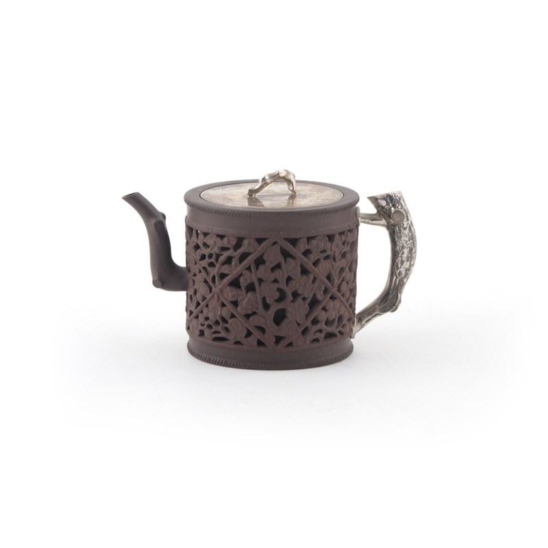An Yixing double-walled teapot with silver cover 18th century, the cylindrical body pierced with a continuous diamond banded design of prunus and pine, the silver metal handle modelled as a branch, unmarked, 16cm. (2)