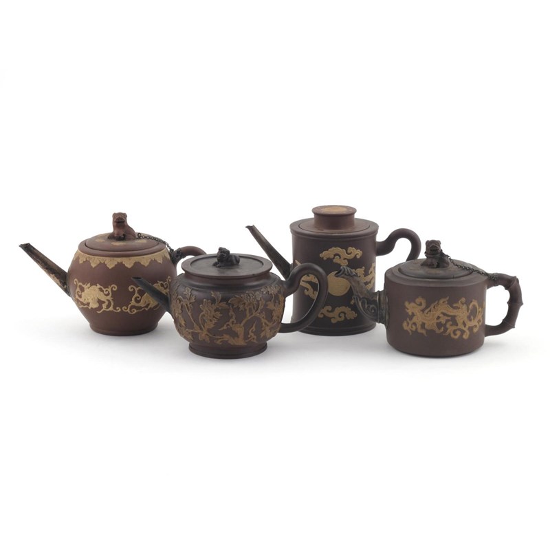 Four Yixing teapots and covers 18th century, two with cylindrical bodies, two globular, all variously applied in cream slip wih dragons, shou characters, mythical beasts and flowers, all with replacement spouts, 20cm max. (6)