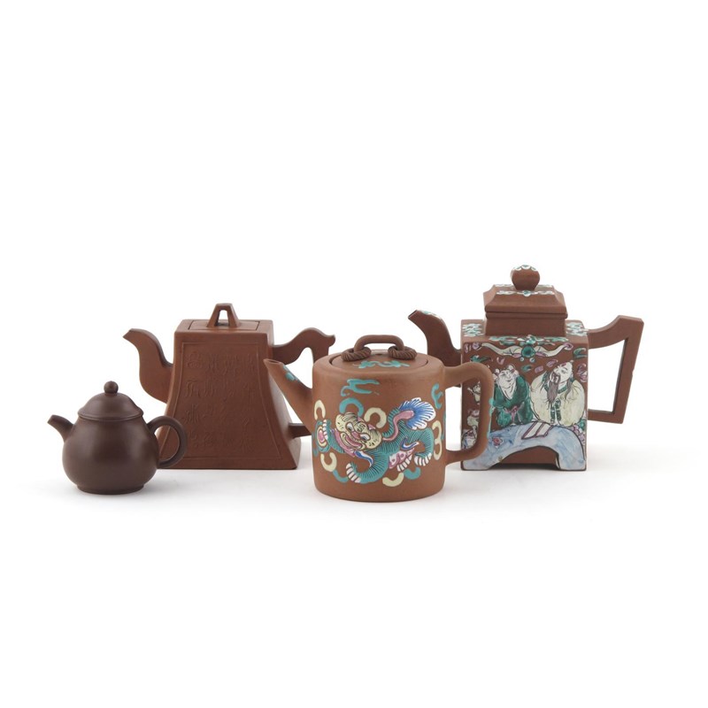 Four Yixing teapots and covers 19th century and later, two enamelled with figures, flowers, lion dogs and fruit, one moulded with a panel of calligraphy, the last pear-shaped and miniature, various impressed marks, small damages and restoration, 17cm max. (8)