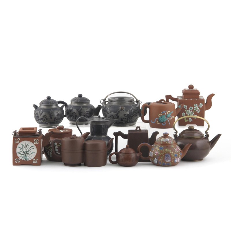 Twelve Yixing teapots and covers 19th century and later, five enamelled with birds, flowers and other designs, one polished for the Thai market, one conjoined, one moulded with a calligraphic panel, one incised with calligraphy, three pewter decorated with a matched sugar bowl and cover, various marks. (26)